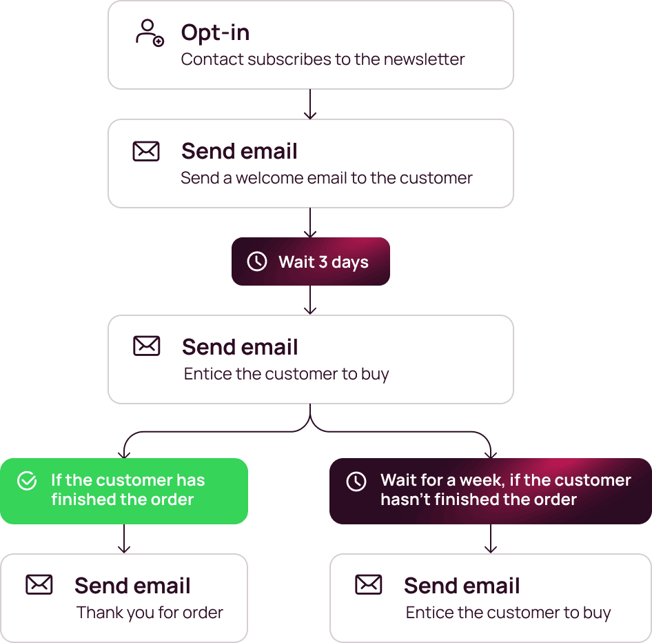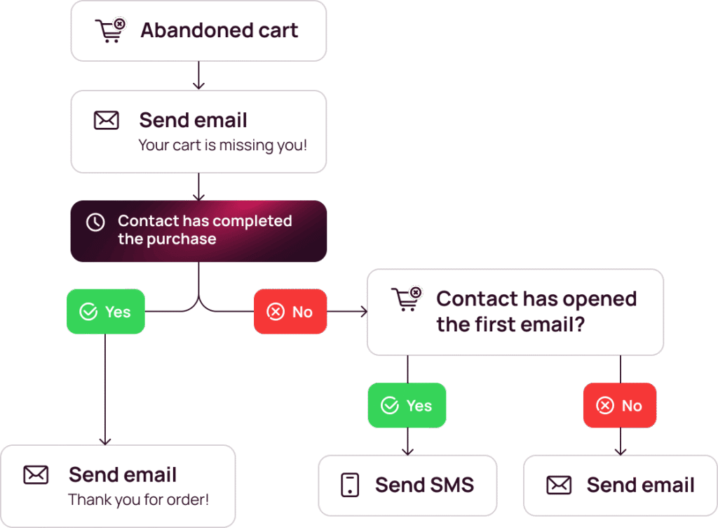 Send emails triggered by real actions: purchases, signups, cart abandonment, or even inactivity.