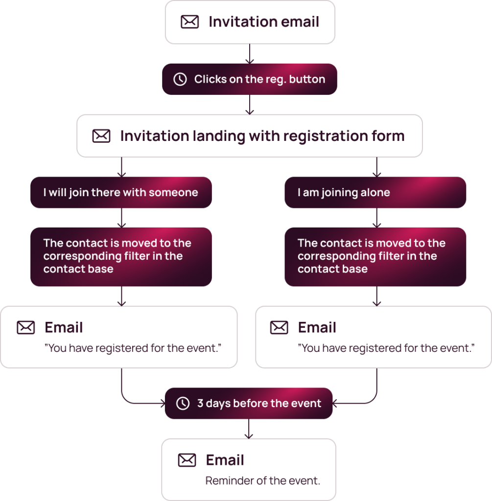 You can send out the event invitation when you have already determined the main composition of the event. The confirmation email should be sent immediately after registration. A repeat invitation’s necessity and timing depend on the time left until the event, how many have already registered, and what the event type is. It is especially recommended to send a repeat invitation for physical events, while it’s not so important for online events. Be sure to always keep in mind that those invited can take into account the time and date of the event well in advance.