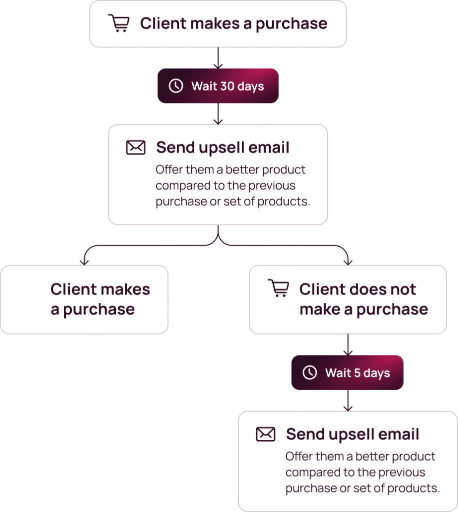 The first upsell or cross-sell email could be sent sometime after the initial purchase, capturing the customer’s interest. If there’s no purchase activity to the initial email, a follow-up can be sent after 5 days, perhaps offering an additional incentive or highlighting a limited-time offer related to the upsell or cross-sell product.